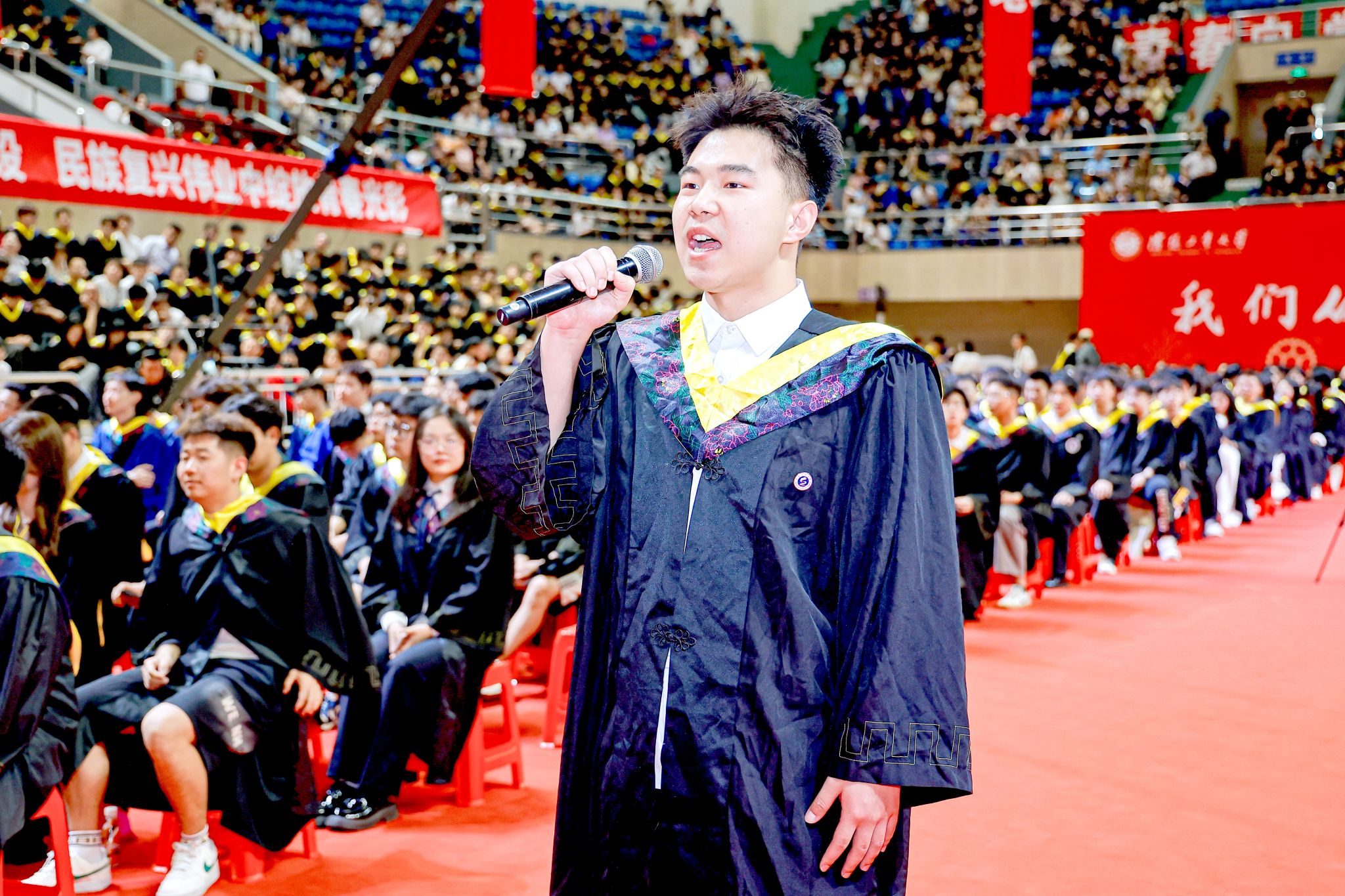 毕业生代表权帅带领全体毕业生向母校庄严宣誓,将始终牢记工大校训,弘扬工大精神,为实现中国式现代化而不懈奋斗。随后,全场齐唱校歌,熟悉的旋律中饱含着对母校的眷恋与成才报国的坚定信念。